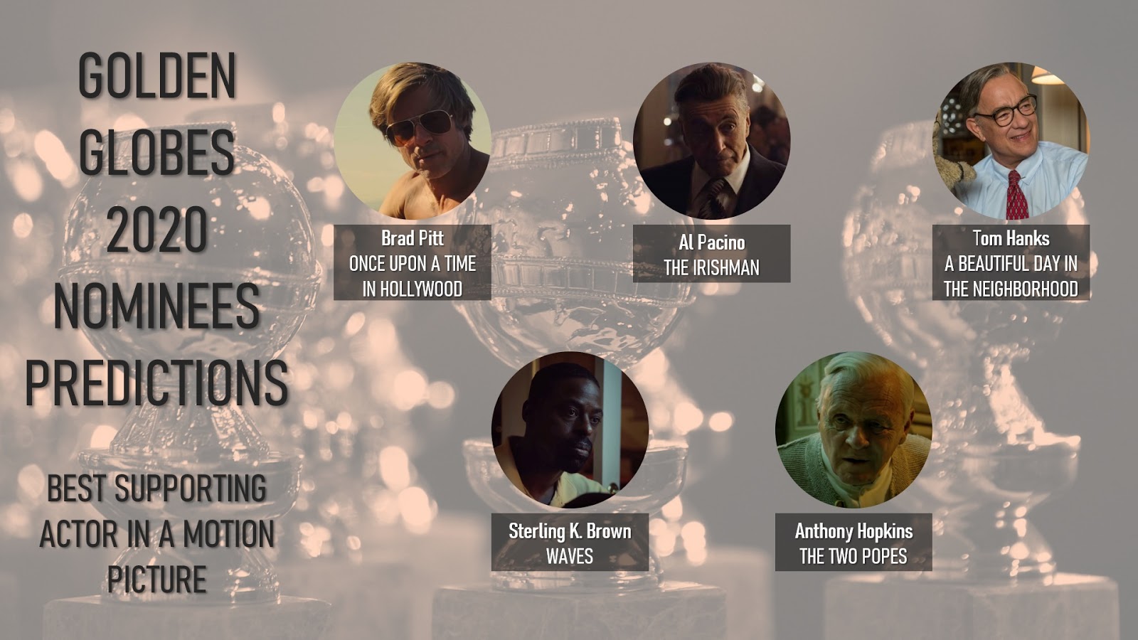 I would say Brad Pitt is not only poised to be nominated for a Golden Globe of Best Supporting Actor for Once Upon a Time in Hollywood, but he's also poised to win it - it's the superstar kind of performance, one that relies on real charisma and good looks and it fits the HFPA tastes perfectly. I also expect Al Pacino to get a nom here for playing Jimmy Hoffa in The Irishman - he was singled out in several reviews and he's a titanic name in the industry, something the Globes always pay attention to! And the same could be said about Tom Hanks and his turn in A Beautiful Day in the Neighborhood: he plays the iconic Mr. Rogers and he got rave reviews for it, plus (unlike the Academy Awards) the Globes haven't snubed any of his major performances since Cast Away (Charlie Wilson's War, Captain Phillips and The Post, all earned Hanks a Golden Globe nomination). As for Sterling K. Brown, Waves is a small independent production and it might not be competing in the "big fields" of Best Picture against some of the season's giants, but the acting performances are solid and K. Brown got plenty of praise... He has already got some recognition from the HFPA for his TV work in This Is Us and American Crime Story: it might just translate to film! The fifth spot is a wildcard... I'm predicting Anthony Hopkins for The Two Popes, simply because he's Sir Anthony Hopkins and he delivers his most impressive performance in years in a movie that's a film festival's audiences favorite - it is known he won't campaign, which might not work for Oscar, but his name alone can generate a Golden Globe nomination. Some other names that might show up here: Kelvin Harrison Jr. for Waves (the HFPA likes "younger", just like Aaron Taylor Johnson v. Michael Shannon in Nocturnal Animals and this young actor is said to be as brilliant as K. Brown in Waves); Joe Pesci for The Irishman (another living legend who might join Pacino easily); and Zack Gottsagen for The Peanut Butter Falcon (an actor who suffers from Down Syndrom but he does delivers an effective and winning performance and I expect the movie to get some love here somewhere). NOTE TO SELF: I think Willem Dafoe (The Lighthouse) might not get nominated because of the category placement/fraud!