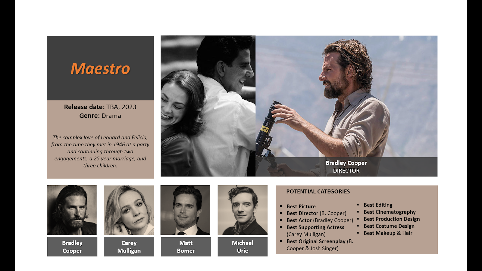 Bradley Cooper's Maestro might be the movie that earns Cooper the Oscar of... Best Actor? Here he plays Leonard Bernstein, the conductor behind West Side Story or On the Waterfront who lived a turbulent marriage to dispel rumours about his homossexuality. This kind of biopics of closeted homossexuals might be controversial and can easily fall into cliché storytelling, but Cooper has already proven he is a fine director and he knows how to handle a narrative. Carey Mulligan is also involved in the project as Bernstein's wife and it might also be a juicy role for one of the most talented actresses out there. Plus, the AMPAS loves biopics about Hollywood figures, so... unless it fails completely, I believe Maestro is a safe awards bet from Netflix.
