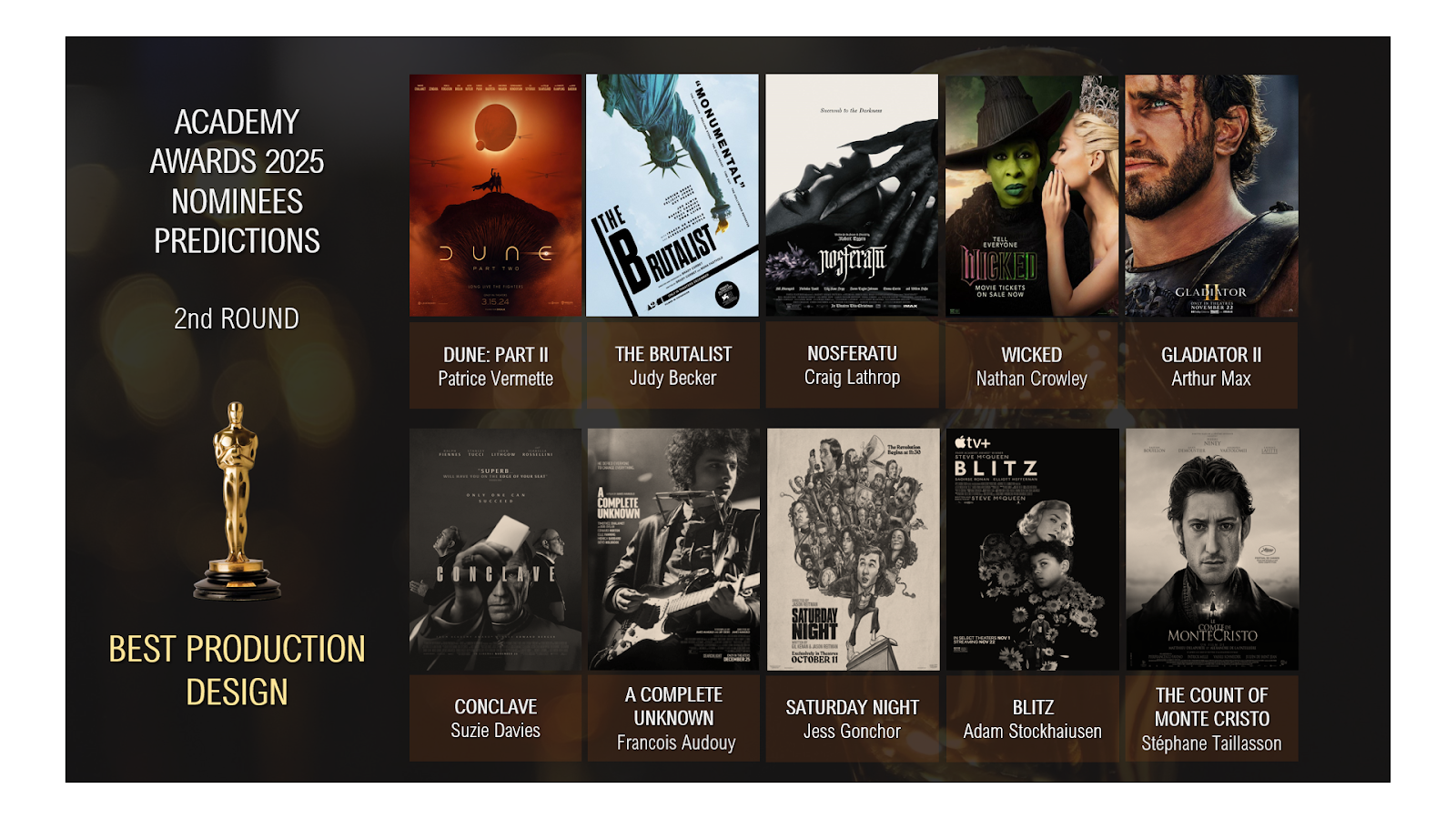 At this point, there are a couple of films that seem locked in the Best Picture shortlist: A24’s The Brutalist and Neon’s Anora seem locked in the top 2 spots, while Focus Features’ Conclave and Netflix’s Emilia Perez are sure bets too. Next, I would name Wicked (Universal’s box-office sensation, critical darling and social media favorite) to be the 5th most voted Best Picture nominee, only to be followed by Warner Bros.’ Dune: Part II (which lost some heat due to an early release and a strong showing of Oscar contenders in the Fall film festival season and end of the year releases). The following spots seem less clear to me: MUBI’s The Substance feels like rising considering the enthusiastic critical response during the critics associations prizes, the strong showing at the Golden Globes and the fact it got shortlisted in multiple BAFTA categories – which is a huge indicator of its Oscar chances if you had the impact of the film in social media, the great campaign around Demi Moore and the impressive box-office numbers. The eight spot goes to James Mangold’s A Complete Unknown, the Bob Dylan biopic that’s distributed by the campaigning machine Searchlight – with solid reviews, the star-power of Timothée Chalamet and a strong campaign, it feels like a really strong bet for Best Picture since the AMPAS can’t resist a good (male-led) biopic. Could the next spot go to Amazon’s Nickel Boys? A film festival darling, a tale of innocence and emotional wounds, with rave reviews and an inventive cinematography take? Well, it might well be since it showed in the right places since the beginning of the awards season: a Golden Globe nomination for Best Motion Picture – Drama; Independent Spirit Award nod for Best Feature; five Critics’ Choice Awards noms, including Best Picture; made the AFI top 10 films of 2024; it won Best Director at the New York Film Critics Circle Awards; and it got thirteen Black Reel Awards nominations, including Best Film.